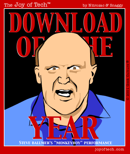 The Joy of Tech's choice for Download of the Year is often controversial, especially in this, its first year. But one must keep in mind that the criterion is the person or thing that has had the greatest impact on the web for good or ill. After much debate and consideration, we have chosen Steve Ballmer's MonkeyBoy video performance as Download of the Year 2001. "Rarely has so improbable a CEO shaken the web stage, and with such abandonment. Ballmer's performance, both shocking and exhilarating, sets a new standard for keynotes.