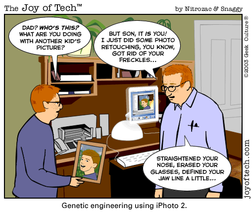 If you're using a Mac and a newer version of Explorer, here's a neat trick courtesy of MacMerc. Drag the above little image to the top tool bar of your browser, it should "stick" afterwards. Now you have a graphical link to the Joy of Tech, one that will update everytime a new comic is uploaded. (You may have to refresh the image manually if it's in your cache.) If you need to delete or move it it, just control button/click and hold, then select delete, or just Command/drag it to the trash.