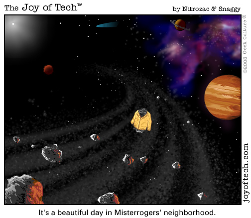 If you're using a Mac and a newer version of Explorer, here's a neat trick courtesy of MacMerc. Drag the above little image to the top tool bar of your browser, it should "stick" afterwards. Now you have a graphical link to the Joy of Tech, one that will update everytime a new comic is uploaded. (You may have to refresh the image manually if it's in your cache.) If you need to delete or move it it, just control button/click and hold, then select delete, or just Command/drag it to the trash.