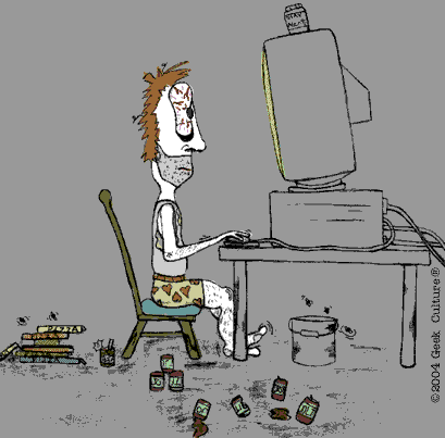 Experts arent sure if its a new disorder, or a symptom of other disorders, or a combination of both. What they do know is there are some cases of extreme Internet addiction where addicted individuals stay on-line for hours/days neglecting other aspects of their lives such as work, school, and family. In one reported case a 21 year-old man stopped going to classes and disappeared for a week, he was found by campus police in the schools computer labwhere he spent seven days straight online! If this person is you, please email us at theaddictedguy@geekculture.com. If this person is not you, and you are worried that you may be seriously addicted to the Internet and are looking for help, check out our Uplinks Geek Psychology section. For those of you who are addicted to shopping and the Internet, please go straight to our Webstore! |