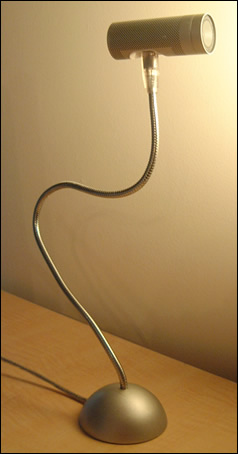 The SightFlex features a chrome plated, flexible steel tube, which is mounted to a painted hemispherical base. The end of the flexible tube is a male 6-pin Firewire connector, where you plug in your iSight camera. Coming out of the base, at the end of about 5 feet of cable, is the other Firewire connector. This is the end you plug into your Mac.