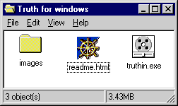 The Truth is available as both a screen saver and as a stand-alone .exe. After purchasing, follow the directions and download the compressed files. Once you have downloaded , extract the folder "Truth for Windows". Opening the folder , you will find instructions (readme.html), an images folder for the document, and the screen saver installer "truthin.exe".