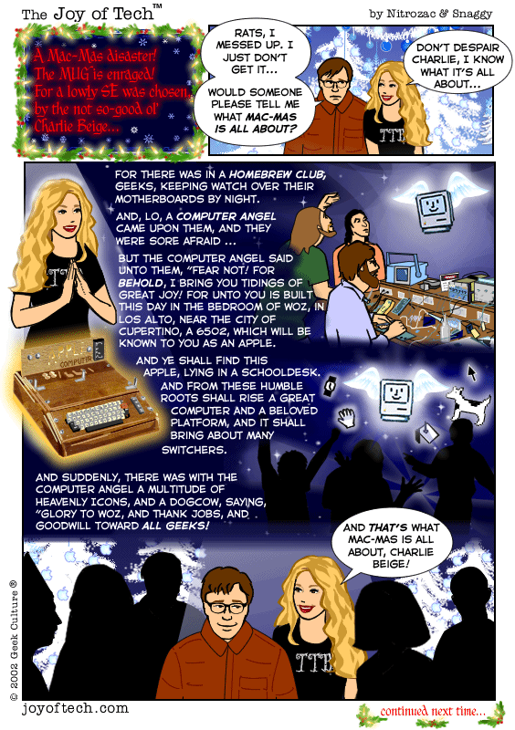 If you're using a Mac and a newer version of Explorer, here's a neat trick courtesy of MacMerc. Drag the above little image to the top tool bar of your browser, it should "stick" afterwards. Now you have a graphical link to the Joy of Tech, one that will update everytime a new comic is uploaded. (You may have to refresh the image manually if it's in your cache.) If you need to delete or move it it, just control button/click and hold, then select delete, or just Command/drag it to the trash.