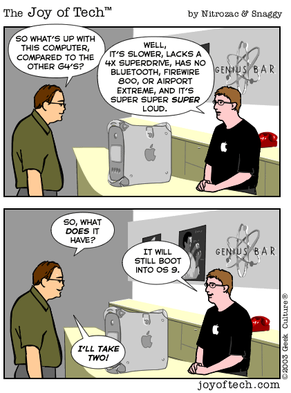 If you're using a Mac and a newer version of Explorer, here's a neat trick courtesy of MacMerc. Drag the above little image to the top tool bar of your browser, it should "stick" afterwards. Now you have a graphical link to the Joy of Tech, one that will update everytime a new comic is uploaded. (You may have to refresh the image manually if it's in your cache.) If you need to delete or move it it, just control button/click and hold, then select delete, or just Command/drag it to the trash.