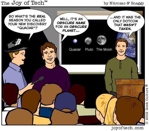 If you're using a Mac and a newer version of Explorer, here's a neat trick courtesy of MacMerc. Drag the above little image to the top tool bar of your browser, it should "stick" afterwards. Now you have a graphical link to the Joy of Tech, one that will update everytime a new comic is uploaded. (You may have to refresh the image manually if it's in your cache.) If you need to delete or move it it, just control button/click and hold, then select delete, or just Command/drag it to the trash.