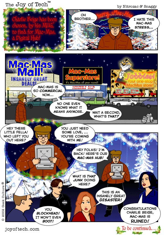 If you're using a Mac and a newer version of Explorer, here's a neat trick courtesy of MacMerc. Drag the above little image to the top tool bar of your browser, it should "stick" afterwards. Now you have a graphical link to the Joy of Tech, one that will update everytime a new comic is uploaded. (You may have to refresh the image manually if it's in your cache.) If you need to delete or move it it, just control button/click and hold, then select delete, or just Command/drag it to the trash.
