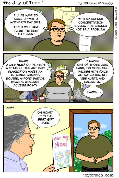 If you're using a Mac and a newer version of Explorer, here's a neat trick courtesy of MacMerc. Drag the above little image to the top tool bar of your browser, it should "stick" afterwards. Now you have a graphical link to the Joy of Tech, one that will update everytime a new comic is uploaded. (You may have to refresh the image manually if it's in your cache.) If you need to delete or move it it, just control button/click and hold, then select delete, or just Command/drag it to the trash.