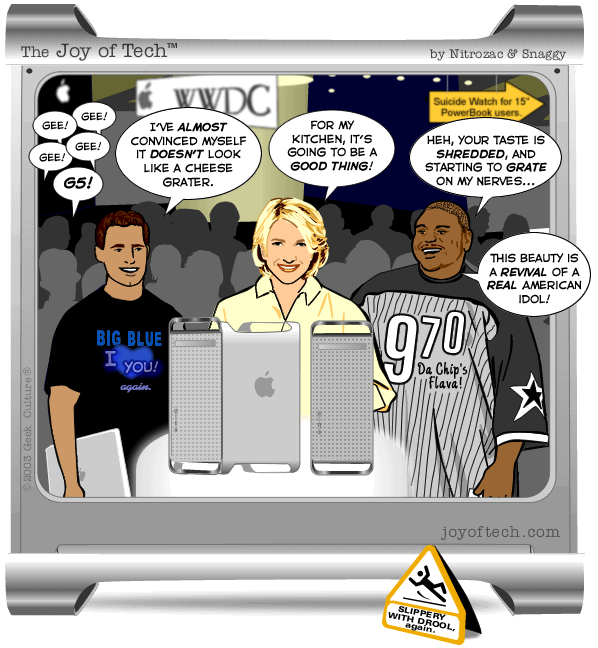 If you're using a Mac and a newer version of Explorer, here's a neat trick courtesy of MacMerc. Drag the above little image to the top tool bar of your browser, it should "stick" afterwards. Now you have a graphical link to the Joy of Tech, one that will update everytime a new comic is uploaded. (You may have to refresh the image manually if it's in your cache.) If you need to delete or move it it, just control button/click and hold, then select delete, or just Command/drag it to the trash.