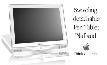 The new iMac will feature a 1 Ghz G4 and come standard with 256 MB RAM. That aside, It will have a detachable 17' display that doubles as a pen tablet which communicates with the base via Airport. (or some other Apple innovation) And when youre all done- and wanna take it over to your friends house along with your keyboard and mouse, you can swivel it 180 degrees and close it just like a notebook. Then carry it like a briefcase thanks to it's trusty backside handle. Other features include standard Nvidia graphics, and side accessible usb/firewire/ethernet ports. Super-Drive in the high end model. :)